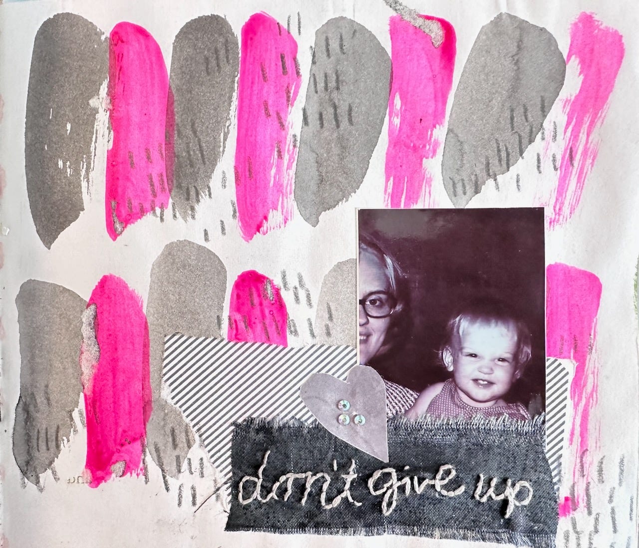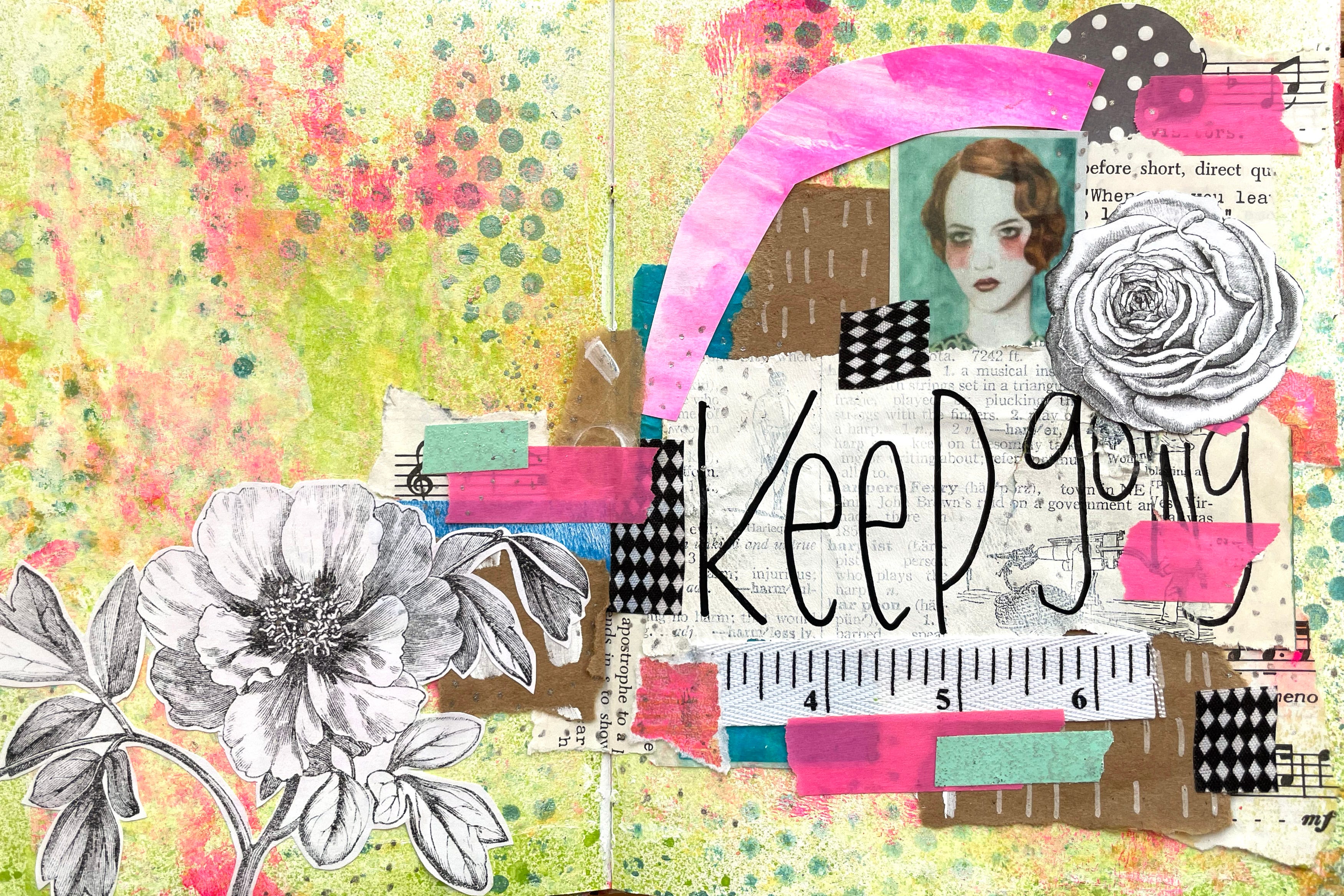 A few days ago, when I was doing my daily writing practice, I wrote KEEP GOING at the end, several times, and I started to wonder how many times I’ve used that phrase in a journal. I know it frequently shows up in my written journaling, but it often becomes the focal phrase on art journal pages as well.